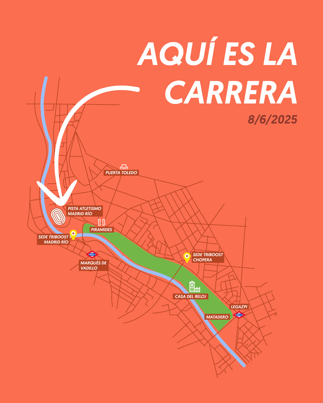 En la nueva pista de atletismo de Madri Río, aquí tienes la ubicación: VER UBICACIÓN CARRERA (Antiguo Vicente Calderón)